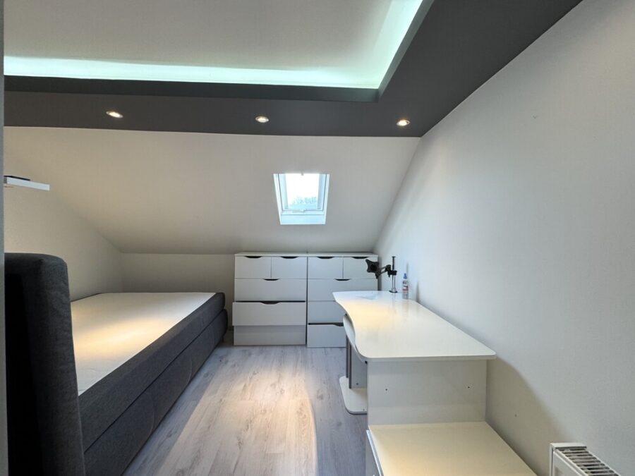 Im Obergeschoss finden Sie ein Kinderzimmer, ein Elternschlafzimmer und ein Tageslichtbad. Das Dachgeschoss ist ausgebaut wo sich ebenfalls ein Zimmer befindet. Im Keller befindet sich ein Souterrain-Zimmer, welches als Arbeitszimmer genutzt werden kann. Im Keller ist ebenfalls ein Hauswirtschaftsraum und Versorgungsraum vorhanden.