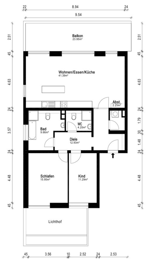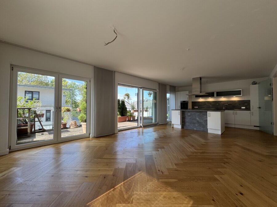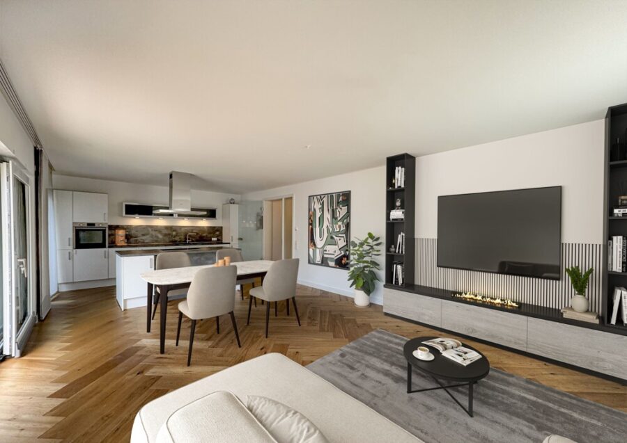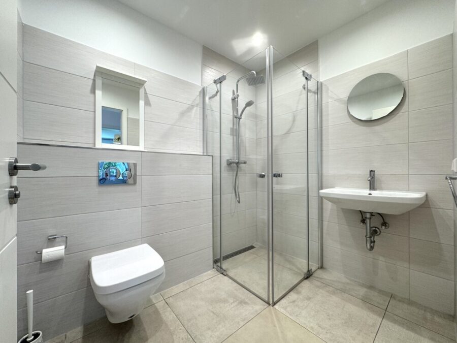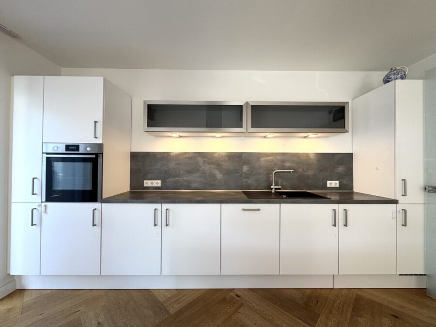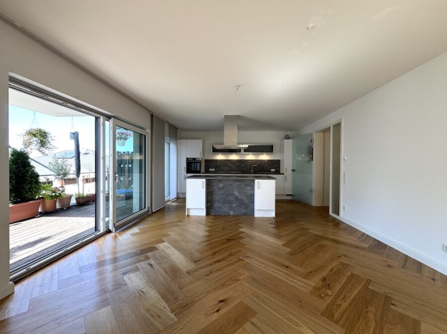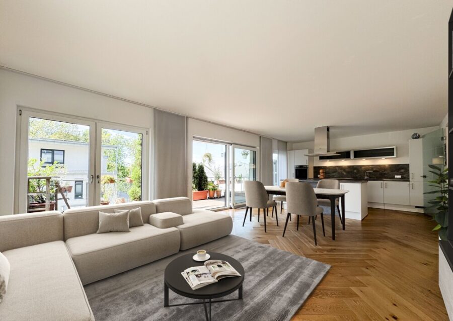 Auf ca. 110,00 m² Wohnfläche erreichen Sie über den Eingangsbereich zuerst die Garderobe und eine Abstellkammer. Anschließend gelangen Sie zum Herzstück der Wohnung, dem großen & offenen Wohnbereich mit Küche. Entspannte Stunden sind hier vorprogrammiert, denn die Kombination aus Platz und Sonnenstrahlen weißt gekonnt zu überzeugen! Von hier aus erreichen Sie den XXL-Balkon mit Süd-Ausrichtung. Die moderne Einbauküche ist im Kaufpreis enthalten. Das Kinderzimmer verfügt über genügend Platz für ein Bett, Schreibtisch und großen Kleiderschrank. Das großzügige Elternschlafzimmer verfügt über eine Klimaanlage und breite Fensterfront mit Zugang zur Terrasse (Lichthof) samt kleiner Rasenfläche. Abschließend finden Sie über die Diele zwei Badezimmer. Ein Tageslichtbad ist ausgestattet mit einer großen ebenerdigen Dusche, WC und Badewanne. Das innenliegende Gäste-Bad verfügt über eine ebenerdige Dusche und WC.