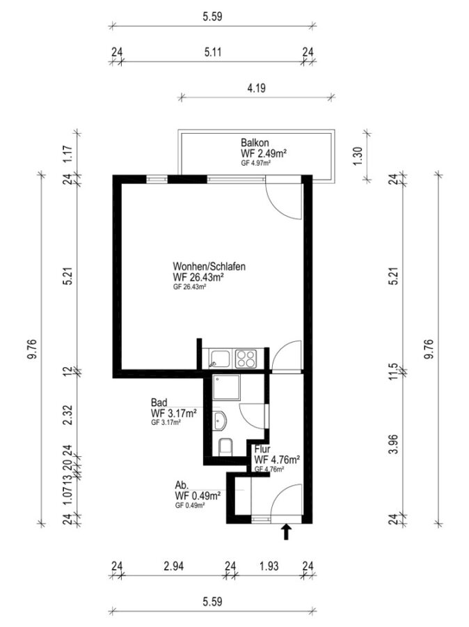 Die Eigentumswohnung bietet auf ca. 38 m² einen Wohn-/Schlafbereich mit einem kleinen Küchenbereich, einen Balkon und ein hell gefliestes Bad.